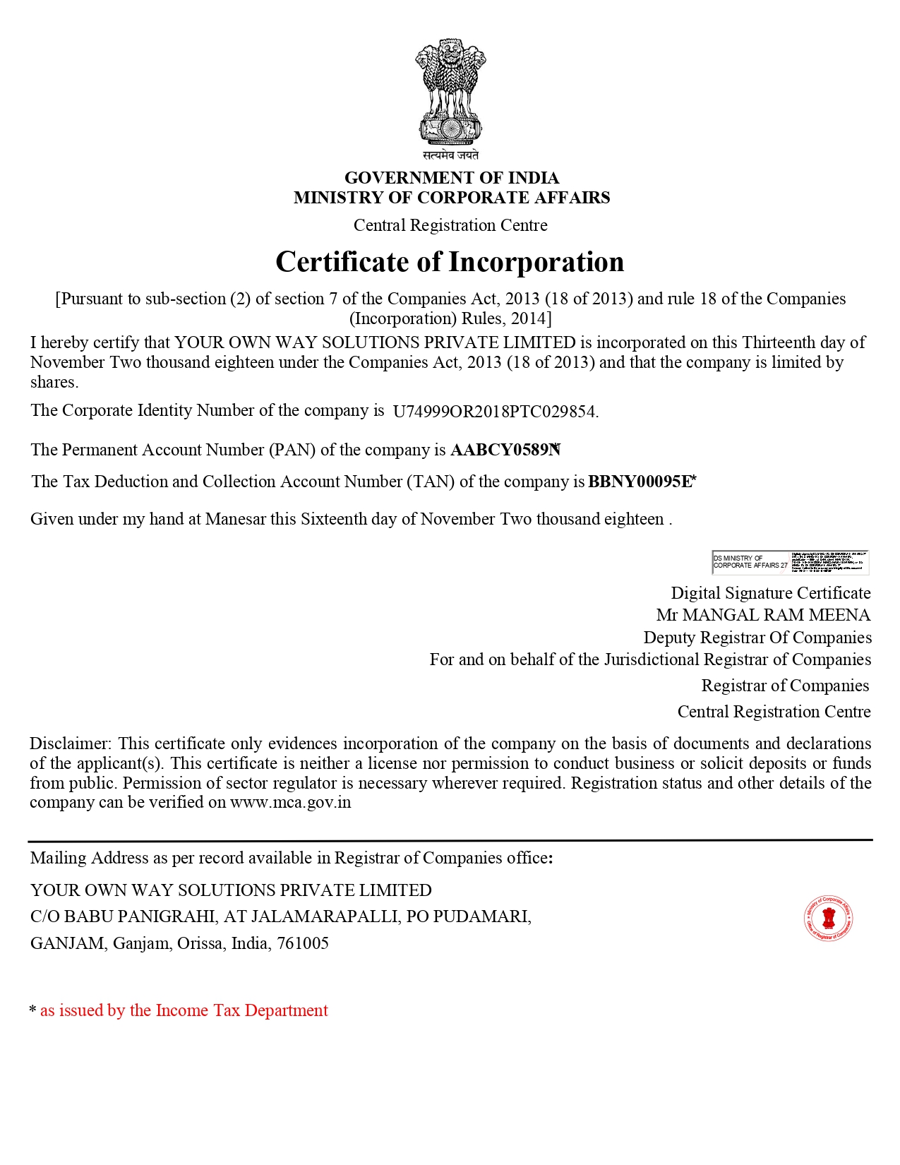 Our Certificate of Incorporation signifies our official recognition and legal validation as a trusted entity. This pivotal document serves as a foundation of our commitment to transparency, accountability, and excellence in all our operations. By obtaining this certificate, we demonstrate our adherence to all regulatory requirements and our dedication to upholding the highest standards of business integrity. Partner with us and experience the assurance that comes from working with a legally established and reputable organization.